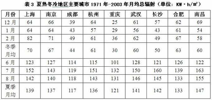 由上表 9可知,對于同一個城市,夏季6、7、8月之間和冬季12、1、2月相應季節之間的月總輻射都比較接近,但城市之間、冬季與夏季之間差異明顯。夏熱冬冷地區總體上太陽資源并不算豐富,唯一的集中時段還是在夏季。夏季總輻射月均值是冬季的2倍以上,其中重慶的夏季月均值是冬季的4倍。在夏季,各城市之間的總輻射月均值差異很小,最小值和最大值分別是117KW·h/㎡和148 KW·h/㎡。在冬季,大部分城市的總輻射月均值在50KW·h/㎡至70KW·h/㎡之間,但小部分城市的冬季總輻射月均值明顯低于平均水平,重慶及成都的冬季總輻射月均值分別是30 KW·h/㎡和44 KW·h/㎡。