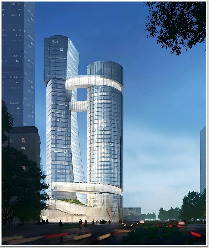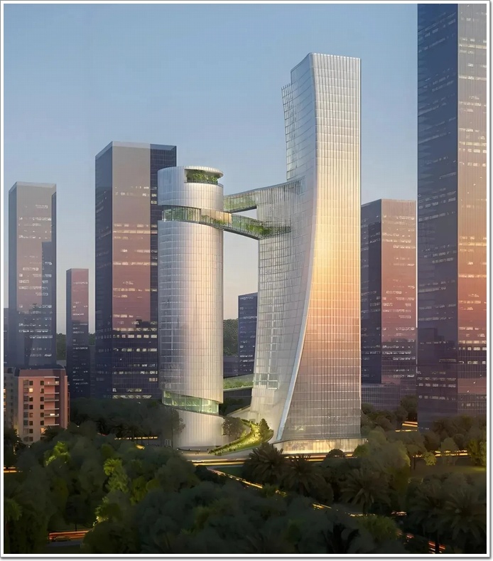 深圳碳云總部大廈的投資額高達45.5億元人民幣!原本預計建成時間為2025年,靈感來自打開的DNA鏈,底部和頂部兩座連廊將連接起兩幢建筑。