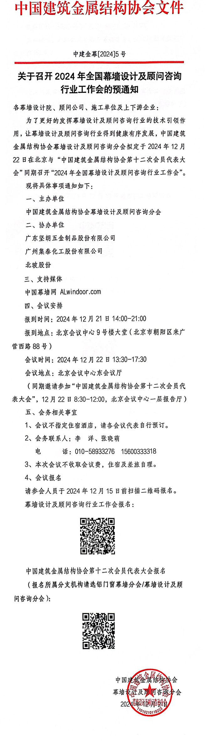 關(guān)于召開(kāi)2024年全國(guó)幕墻設(shè)計(jì)及顧問(wèn)咨詢(xún)行業(yè)工作會(huì)的預(yù)通知