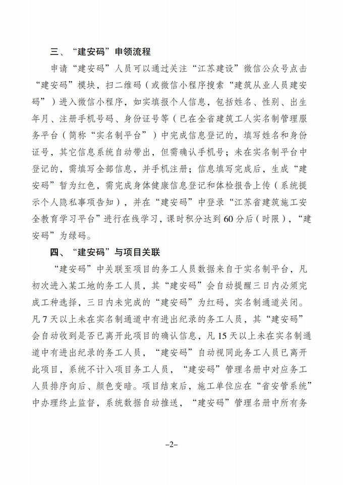 (一)高度重視“建安碼”推廣。試點地區建設主管部門要嚴格按《江蘇省建安碼實施管理方案》(附件2)工作要求,落實“建安碼”推廣工作部署安排,確保推廣工作順利開展。