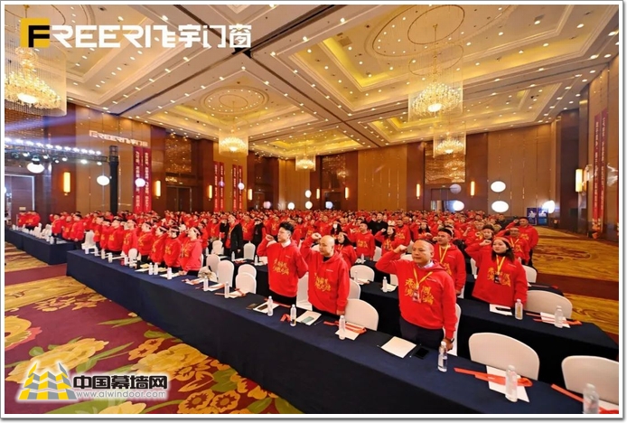 現(xiàn)場,每一位飛宇的家人,都身著印有大會主題的中國紅衛(wèi)衣,仿佛一團(tuán)團(tuán)燃燒的火焰,彰顯著熱情和決心。紅色,代表著活力、激情和勇氣,也寓意著新的一年里,飛宇門窗將與經(jīng)銷商們家人們攜手共進(jìn),共譜新篇。