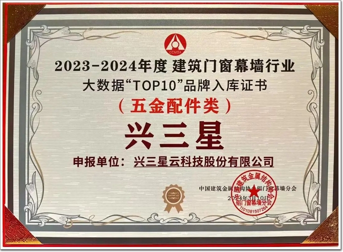 大會中,中國建筑金屬結(jié)構(gòu)協(xié)會鋁門窗幕墻分會發(fā)布“2023-2024年度第十九屆AL-Survey門窗幕墻行業(yè)年度大型讀者調(diào)查暨‘我最喜愛幕墻工程’評選活動”(以下簡稱“AL-Survey”)年度榜單。興三星以專業(yè)的產(chǎn)品、持續(xù)迸發(fā)的品牌創(chuàng)新力榮獲五金配件十大首選品牌、大數(shù)據(jù)“TOP10”品牌入庫證書。