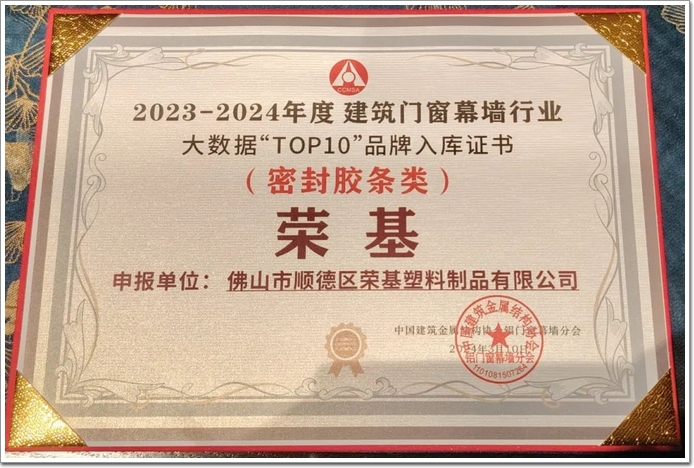 榮基蟬聯中國門窗幕墻行業“密封膠條十大首選品牌”
