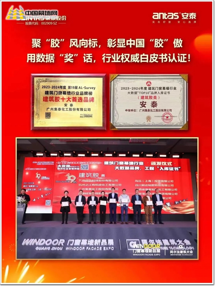 憑借強大的產品研發能力、突出的市場影響力、廣泛的用戶認可度,集泰股份第19次獲得“建筑膠十大首選品牌”的稱號,并入選了建筑門窗幕墻行業大數據“TOP10品牌”。連續多年蟬聯,激勵我們要做得更多、更好、更用心。