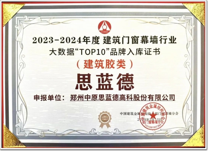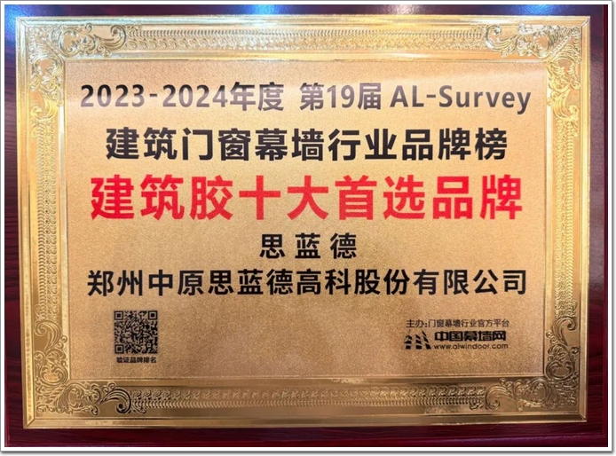 2024年3月10日,第19屆中國(guó)門(mén)窗幕墻行業(yè)十大首選品牌評(píng)選揭曉。鄭州中原思藍(lán)德高科股份有限公司憑借其卓越的品質(zhì)、強(qiáng)大的研發(fā)實(shí)力以及良好的市場(chǎng)口碑,再次榮登榜單,進(jìn)一步鞏固了在中國(guó)建筑門(mén)窗幕墻密封膠行業(yè)的領(lǐng)導(dǎo)地位。
