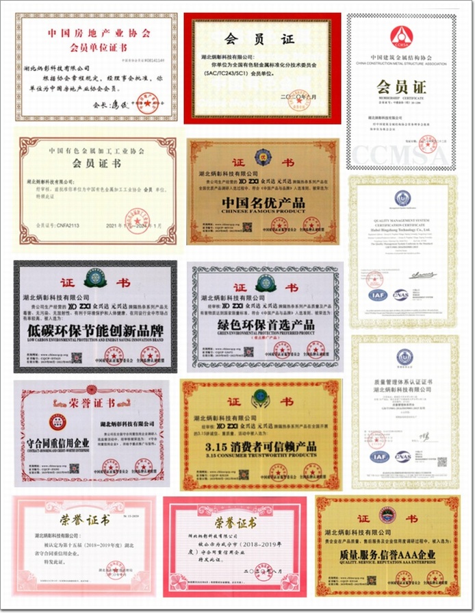 榮譽炳彰|公司是湖北省高新技術企業(詞條“高新技術企業”由行業大百科提供)、 2020年湖北省返鄉創業示范單位、湖北省 “守合同重信用”企業、湖北省專精特新“小巨人”企業、湖北省制造業單項冠軍企業、ISO9001認證企業、中國建筑金屬結構協會會員單位、中國有色金屬加工工業協會會員單位、中國房地產業協會會員單位、全國有色輕金屬標準化分技術委員會會員單位、中國建筑節能協會理事單位、廣東省有色金屬學會鋁加工專業委員會會員單位、廣東(南海)鋁加工產業聯盟成員單位、獲中國鋁加工行業(隔熱條)優秀供應商、2022年2023年房地產開發企業綜合實力TOP500首選供應商、隔熱條國產品牌、全國有色金屬標準化技術委員會技術標準優秀獎、中國質量認證監督委員會全國品牌認證聯盟授與“低碳環保節能創新品牌”“質量、服務、信譽AAA企業”“中國名優產品”“綠色環保首選產品”“3.15消費者可依賴產品”“守合同重信用企業”,等多項榮譽稱號。
