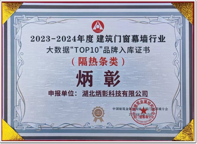湖北炳彰科技有限公司是一家主要專注于建筑鋁型材(詞條“鋁型材”由行業大百科提供)用“PA66GF25”聚酰胺隔熱條的設計、生產和銷售的企業。中國建筑金屬結構協會鋁門窗幕墻分會組織開展的“第19次行業數據申報工作”得到了行業內企業的大力支持,收集到了來自行業內近千家企業的年度行業數據。在此基礎上,分會為了更好服務行業并遴選出優質企業與品牌,開展了“建筑門窗幕墻行業品牌大數據入庫推薦”活動,并于3月10日年會上為入選企業頒發入庫證書。“炳彰”作為2023-2024年度建筑門窗幕墻行業大數據“TOP10”品牌入庫(隔熱條類)上榜企業,上臺領取了榮譽證書。