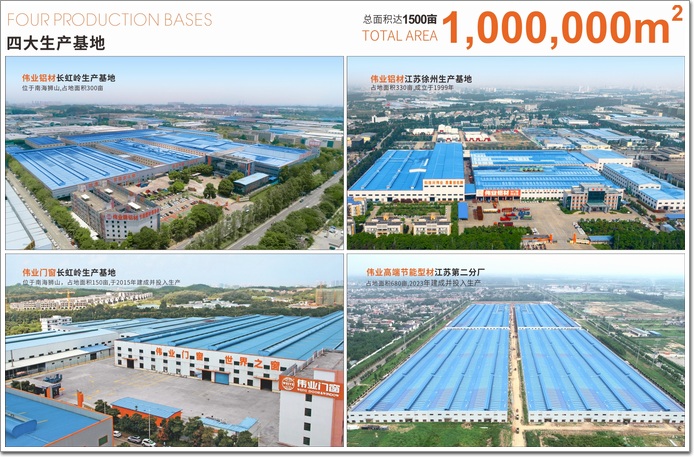 偉業集團擁有4大先進鋁材產業基地,包括廣東總廠、偉業鋁材江蘇一廠、剛投產的偉業鋁材江蘇二廠、偉業門窗生產基地,總占地近1500畝。目前現有超100條自動化智能擠壓(詞條“擠壓”由行業大百科提供)生產線(詞條“生產線”由行業大百科提供),年產能超70萬噸,不斷推動鋁加工行業高質量發展轉型升級。