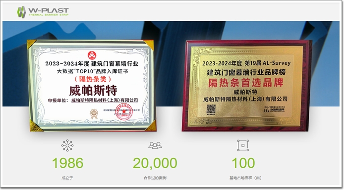 威帕斯特隔熱材料(上海)有限公司作為2023-2024年度建筑門窗幕墻行業大數據"TOP10"品牌入庫證書(進口隔熱條類)上榜企業,上臺領取證書。