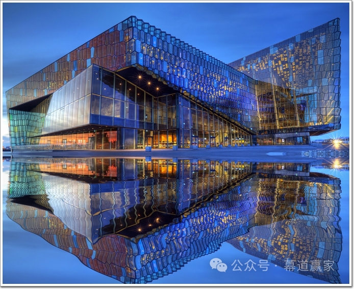 下圖音樂廳建筑師意圖是,這件備受推崇的藝術品應該與其環境形成密切的相互關系。冰島不斷變化的光線和海邊的位置反映在二向色玻璃中色彩和光線的相互作用中。