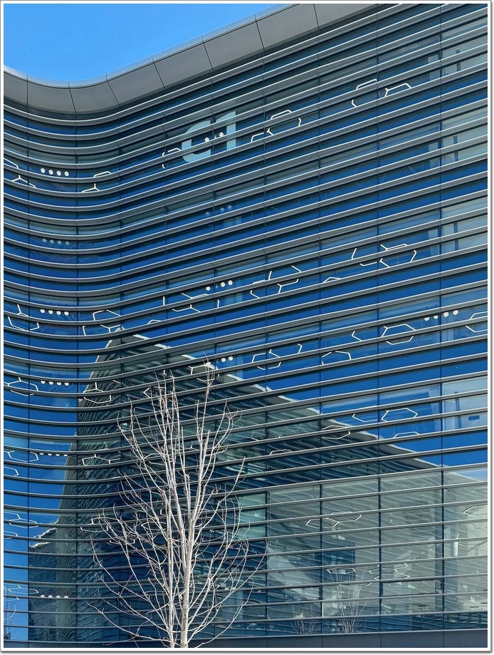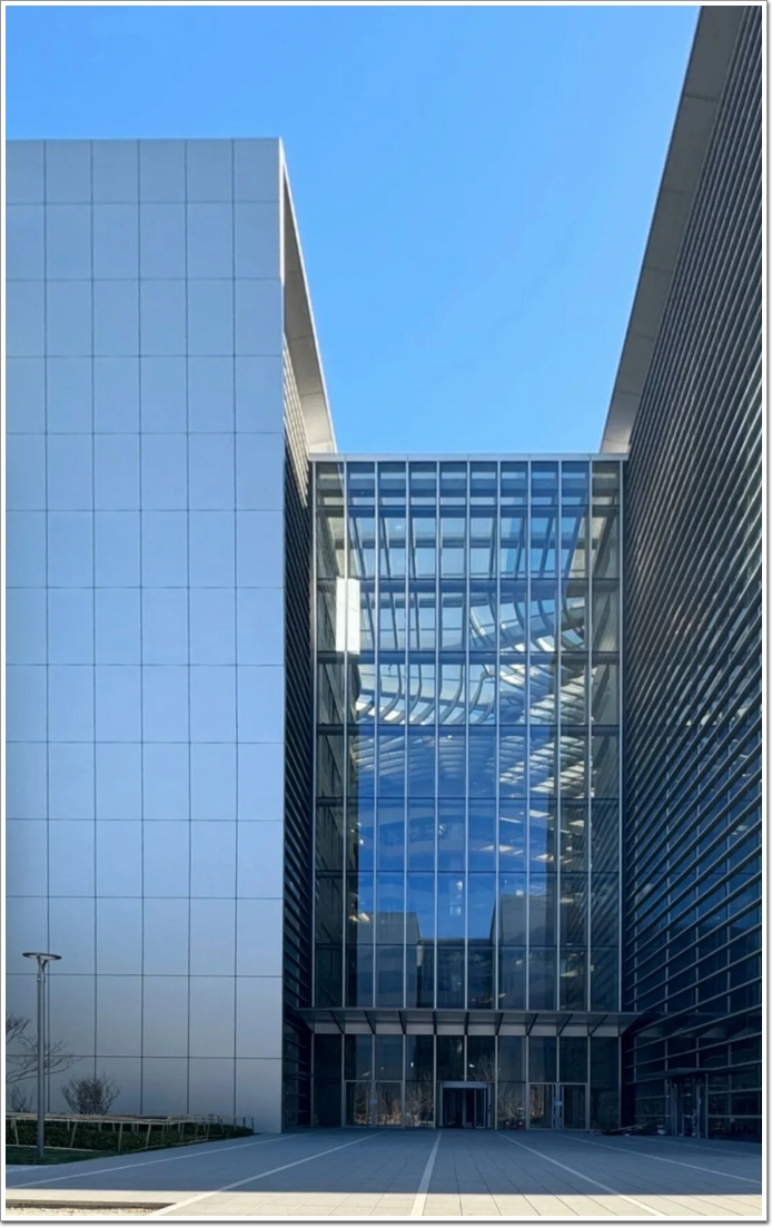 辦公樓外景(攝影:王祥東)其中,辦公區采用橫明豎隱半隱框框架式幕墻,及豎明橫隱半隱框框架式幕墻,結合深度在200毫米—600毫米之間變化的水平金屬鋁(詞條“金屬鋁”由行業大百科提供)板百葉,以適應多變的外觀造型設計。