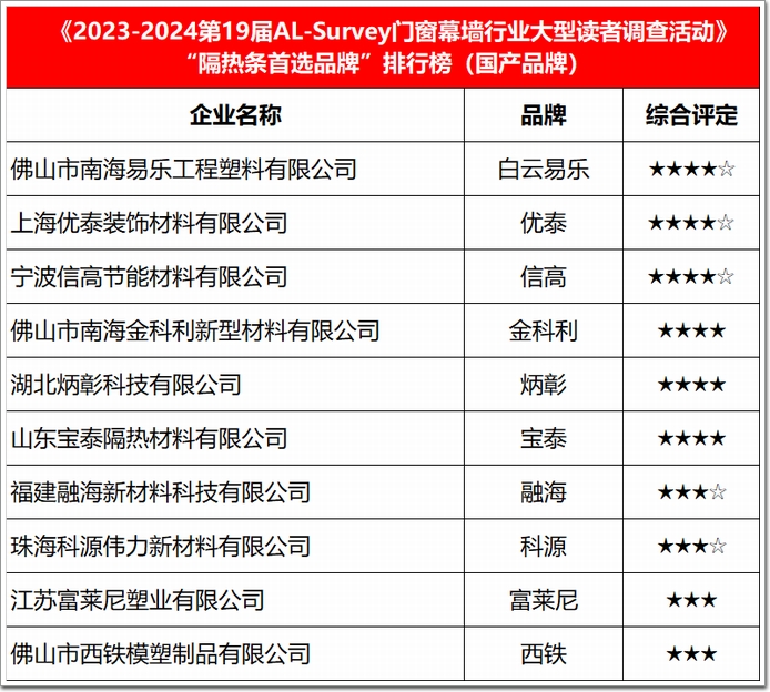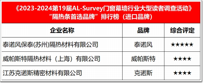 建筑隔熱條的領軍企業、技術專家型代表包括:泰諾風、白云易樂、優泰、信高等品牌企業,市場占有率高、產品性能優。同時,多年來重視產品創新與升級的行業標桿金科利、炳彰等品牌度提升明顯;威帕斯特、克諾斯等進入國內較早的海外品牌極具競爭力;融海、科源、寶泰、西鐵、富萊尼等品牌企業是行業的生力軍。