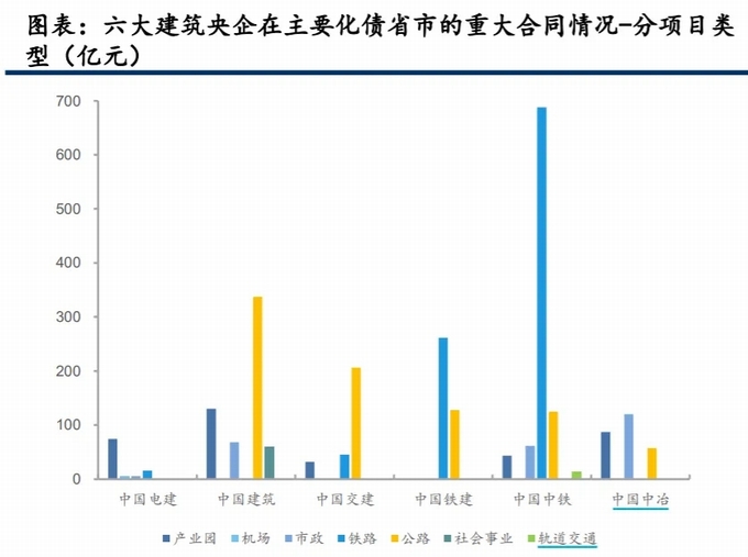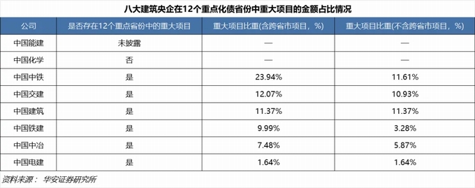 根據八大建筑央企2023年公布的各類重大項目合同,中交、中國中鐵、中建重大項目在12個重點省份中占比較高,中國鐵建、中國中冶、中國電建次之,中國化學不存在上述重點省份的重大項目。