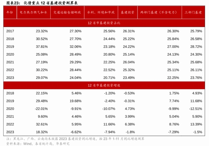 2023全年,重點化債省份基建投資或同比下滑。 根據各省統計局數據,華泰研究測算 2023年12省市合計交通運輸、倉儲和郵政業/電力、熱力、燃氣及水的生產和供應業/水利、環境和公共設施管理業固定(詞條“固定”由行業大百科提供)資產投資完成額累計同比-6.6%/+18.3%/-7.9%。