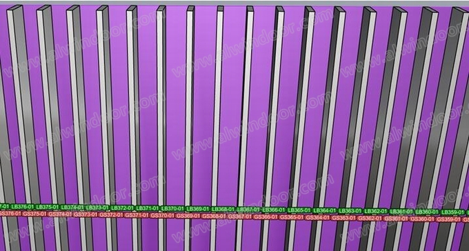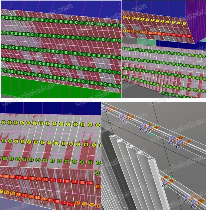 大曲面內側豎向格柵造型,為陶板面內偏移的直紋扭面,采用50mm×250mm格柵型材間隔200mm布置,數量共有2111根格柵型材和2110條間隔鋁型材。
