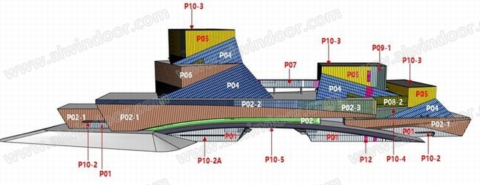 項目幕墻形式主要包括:P01高透豎明橫隱玻璃幕墻系統、P02-1直紋扭面陶板幕墻系統、P02-2/3直紋扭面玻璃/采光頂系統、P02-4全玻幕墻系統、P03/06陶板幕墻系統(平板型、波浪型)、P04玻璃采光頂及室內遮陽簾與拉網板系統、P05陶棍+玻璃雙層幕墻系統、P07連橋-豎明橫隱玻璃幕墻/采光頂系統、P08大跨度豎明橫隱玻璃幕墻系統(空中花園)、P09豎明橫隱玻璃幕墻系統、P10-1~4室外雨蓬、屋頂格柵、吊頂蜂窩板(詞條“蜂窩板”由行業大百科提供)系統、P10-5水泥耐力板系統、P12防火(詞條“防火”由行業大百科提供)幕墻/防火采光頂系統。