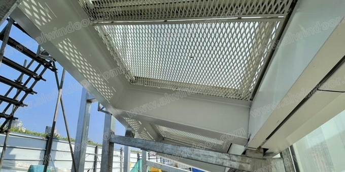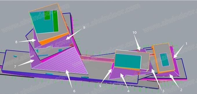 項目共有10個傾斜角度,主次龍骨夾角各異的采光頂系統,傾斜角度范圍13.6°~77.1°,系統構造層次多樣,由外至內面材依次為Low-E中空夾膠彩釉玻璃、電動遮陽簾、金屬拉網板。采光頂內側主體鋼構(詞條“鋼構”由行業大百科提供)形式復雜,原方案要求對主體鋼構進行鋁板造型包飾,且鋁板造型尺寸需結合各采光頂主鋼構截面對應外偏一定數值,以滿足室內“工”字型的外觀效果;采光頂內側距室內最大跨度達35米,工序復雜,施工難度極大。
