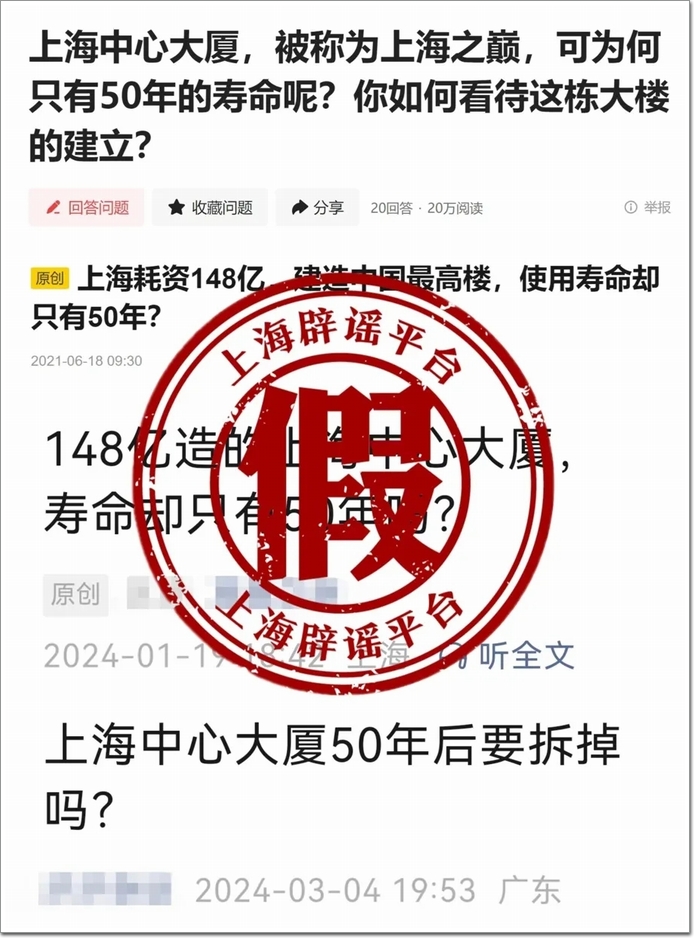 上海中心大廈屬于特別重要的建筑結構,按規定其設計使用年限不低于100年。因此“50年后,上海中心可能會面臨被拆除的風險”這種說法本身就站不住腳。