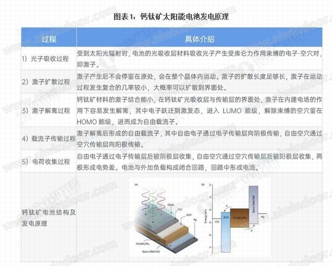 鈣鈦礦太陽能電池是利用鈣鈦礦型的有機金屬鹵化物半導體作為吸光材料的太陽能電池,其發電原理基于半導體的光生伏特效應,利用電子和空穴對產生電流。鈣鈦礦電池器件的工作機制總體可以被劃分為五個過程:光子吸收過程、激子擴散過程、激子解離過程、載流子傳輸過程以及電荷收集過程。經過五個過程后,自由電子通過電子傳輸層后被陰極層收集,自由空穴通過空穴傳輸層后被陽極收集,兩極形成電勢差,電池與外加負載構成閉合回路,回路中形成電流。