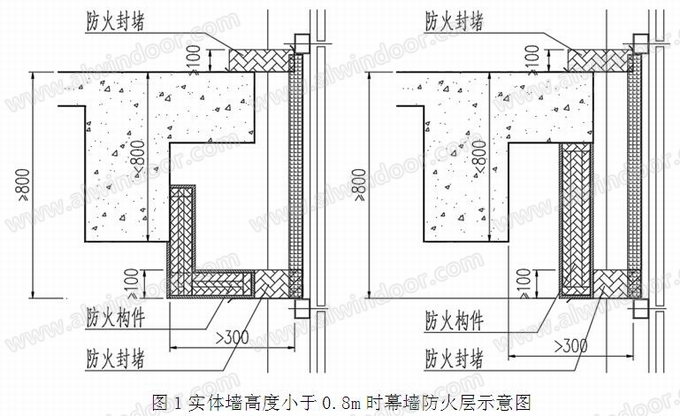 當(dāng)主體結(jié)構(gòu)不燃性實(shí)墻體高度小于0.8m時(shí),幕墻防火層底部至結(jié)構(gòu)頂面的有效高度不應(yīng)小于0.8m,具體詳見圖1。同時(shí),為達(dá)到主體結(jié)構(gòu)(鋼筯混凝土梁)相同的耐火極限,應(yīng)增設(shè)幕墻防火層構(gòu)件系統(tǒng),防火構(gòu)件的耐火隔熱性同樣也不應(yīng)小于1.00h,并獨(dú)立支承在主體結(jié)構(gòu)上。幕墻防火構(gòu)件可采用國家標(biāo)準(zhǔn)《建筑設(shè)計(jì)防火規(guī)范》GB50016-2014附錄中的附表1“各類非木結(jié)構(gòu)構(gòu)件的燃燒性能和耐火極限”非承重墻部分提供的構(gòu)件,如采用兩塊8mm厚硅酸鈣板(詞條“硅酸鈣板”由行業(yè)大百科提供)中間填厚度為75mm以上,容重為100kg/m3的巖棉等,也可采用經(jīng)國家級(jí)相關(guān)權(quán)威機(jī)構(gòu)認(rèn)可的其它防火構(gòu)件。