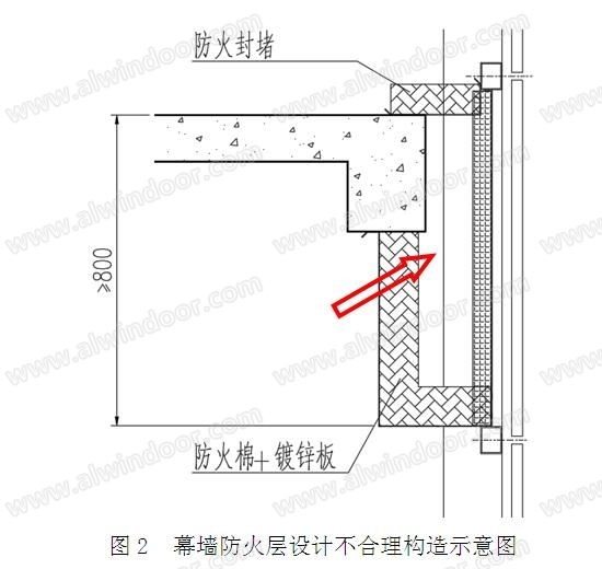 但實(shí)際幕墻工程中,該部位往往只是采用1.5mm厚鍍鋅鋼板+防火巖棉的防火構(gòu)造措施,來替代圖1中的防火構(gòu)件,但該防火構(gòu)件系統(tǒng)只能滿足1.00h的耐火完整性要求,無法滿足1.00h的耐火隔熱性要求,可能存在安全隱患,具體如圖2所示。