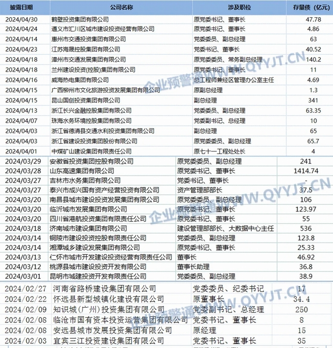 中國幕墻網ALwindoor.com從“企業預警通”了解到:僅在2023年1月-2024年4月,就已有約160家發債城投公司的高管被調查,職位主要是黨委書記、董事長、總經理和副總經理,均為實權主體。