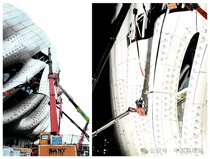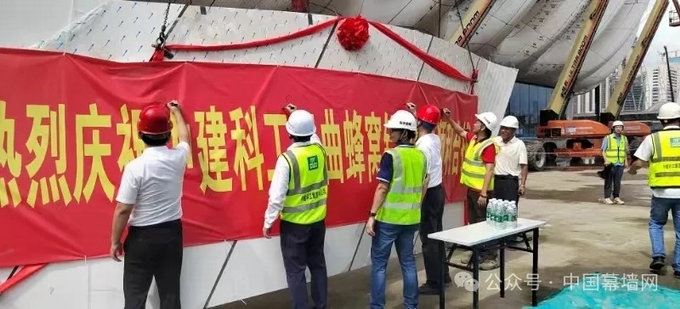“工”克新難題!挑戰新速度!鑒于項目體量大、工期短,造型復雜、多樣等建筑特點,中建科工集團有限公司深圳市體育中心(體育館)幕墻項目團隊,對原幕墻招標圖紙進行深入研究,結合現有技術條件,及現場施工環境綜合考慮,提出創新型建議:將原框架式鋁板幕墻(詞條“鋁板幕墻”由行業大百科提供),改為:單元式幕墻,將雙曲蜂窩鋁板劃分為72榀,共計1008個單元。