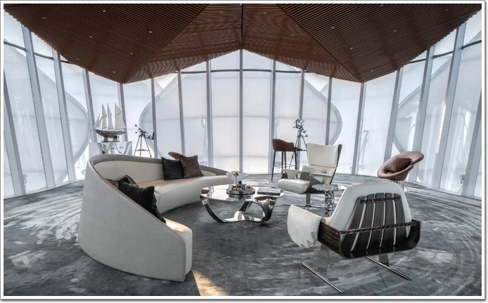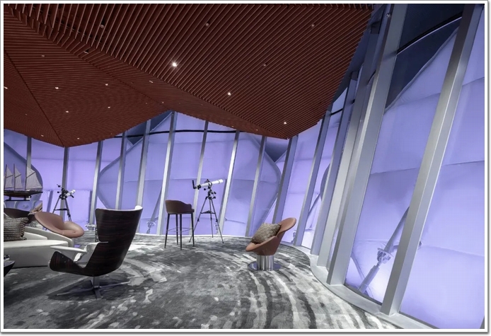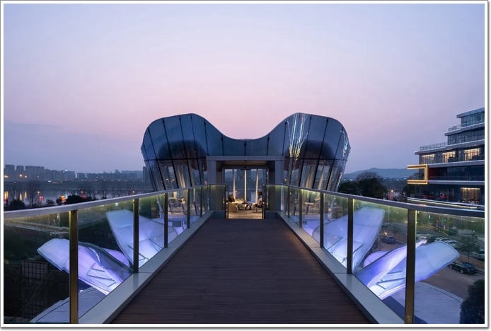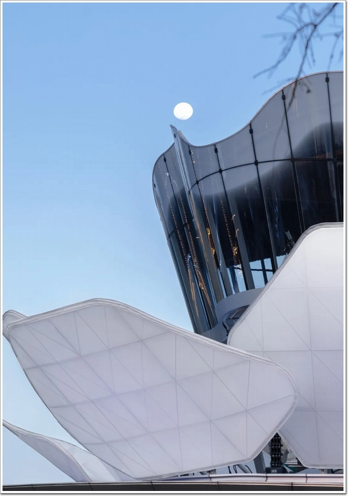 中心主體觀光廳在倒圓臺的基礎形上演化而來,回應花蕊簇擁下的生動空間效果,通體環繞雙曲面玻璃。