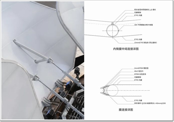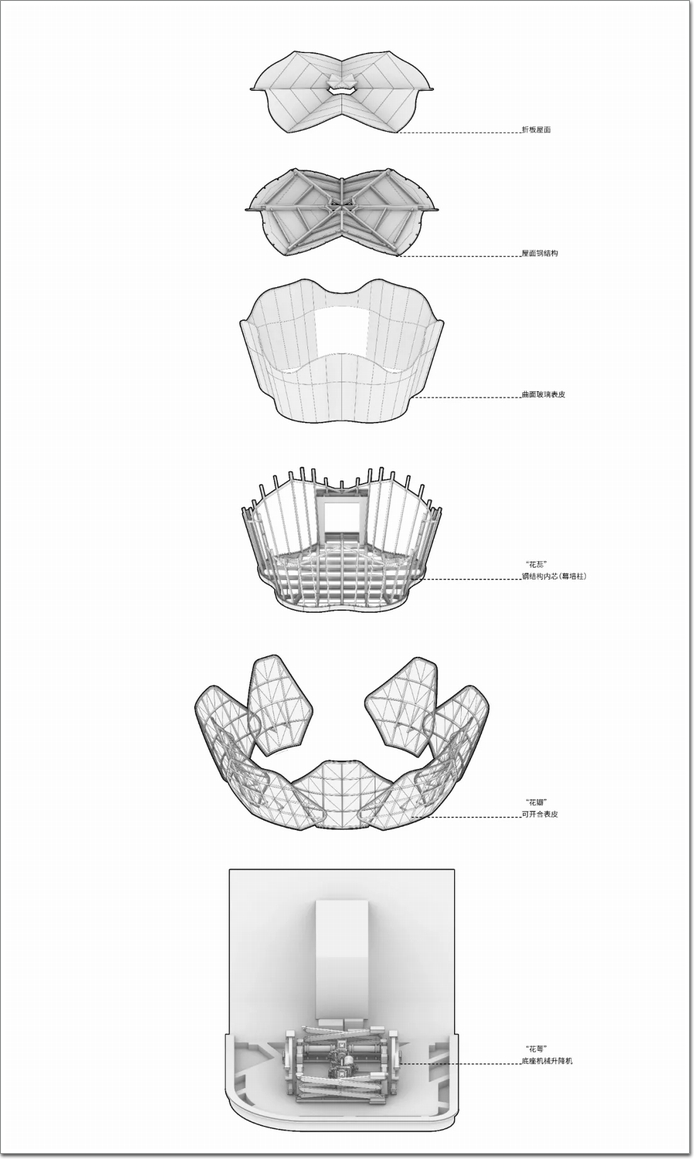 開合表皮系統中的每片花瓣通過雙曲造型鋼(詞條“型鋼”由行業大百科提供)架連接底部液壓桿,錯層穿插的布置形式實現有序開合。