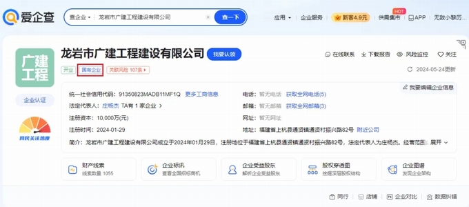 “愛企查”顯示:龍巖市廣建工程建設有限公司(國有企業)成立于2024年01月29日。注冊地位于福建省上杭縣通賢鎮通賢村振興路82號,法定代表人為莊楊杰。