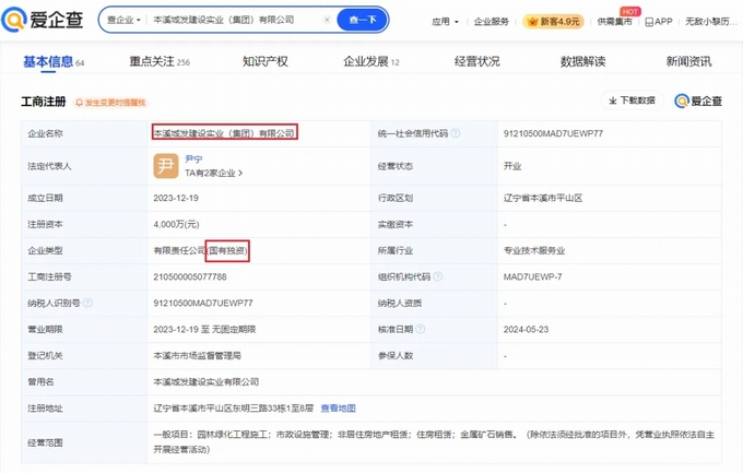 “愛企查”顯示:本溪城發建設實業集團(國有獨資)成立于2023年12月19日,注冊地位于遼寧省本溪市平山區東明三路33棟1至8層,法定代表人為尹寧。