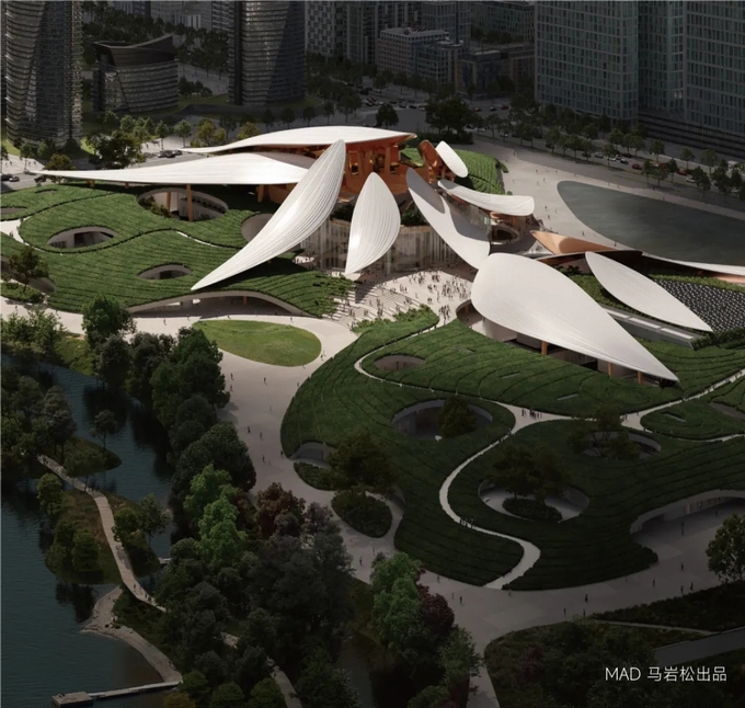 安吉“兩山”未來科技城文化藝術中心由MAD建筑設計事務所馬巖松主創,由中國建筑第八工程局總包。設計以兩岸視覺通廊為軸布局,場地中央并沒有被龐然建筑所占據。中軸連廊成為了開放的戶外平臺,為市民提供了活動和觀景的空間,讓場地充滿儀式感。場地的高點,是多片像是隨意散落的“竹葉”,層疊錯落,覆蓋在茶田之上,充滿雕塑感的同時,也顯現了幾分輕盈和靈動。金屬“竹片”屋頂的紋路,像是葉脈,增添了生動的自然氣息。