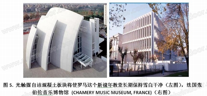 歐洲對光觸媒自潔技術也非常重視,1998意大利建造的羅馬千禧教堂(Jubilee Church)就應用了大面積的光觸媒自潔混凝土板,2003年就開始有了第一個光觸媒自潔建筑項目落地—法國張伯倫音樂博物館 (CHAMERY MUSIC MUSEUM, FRANCE)(圖5)。