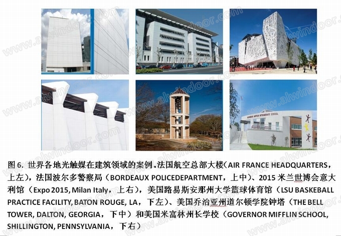 作為“競爭力與可持續性發展”的歐洲計劃的一部分,歐盟在2001至2005年期間為開發及評估光催化凈化空氣立項,項目全稱為Photocatalytic Innovative Coverings Applications for Depollution Assessment, 簡稱PICADA,項目的中文名稱可翻譯為“光催化創新涂覆去污染應用評估”。PICADA項目結束后一大批光觸媒自潔建筑項目在歐洲及美國出現,例如法國航空總部大樓(AIR FRANCE HEADQUARTERS)、法國波爾多警察局(BORDEAUX POLICEDEPARTMENT)、2015米蘭世博會意大利館(Expo 2015, Milan Italy)美國路易斯安那州大學籃球體育館(LSU BASKEBALL PRACTICE FACILITY, BATON ROUGE, LA)、美國喬治亞州道爾頓學院鐘塔(THE BELL TOWER, DALTON, GEORGIA)和美國米富林州長學校(GOVERNOR MIFFLIN SCHOOL, SHILLINGTON, PENNSYLVANIA)等(見圖6)。