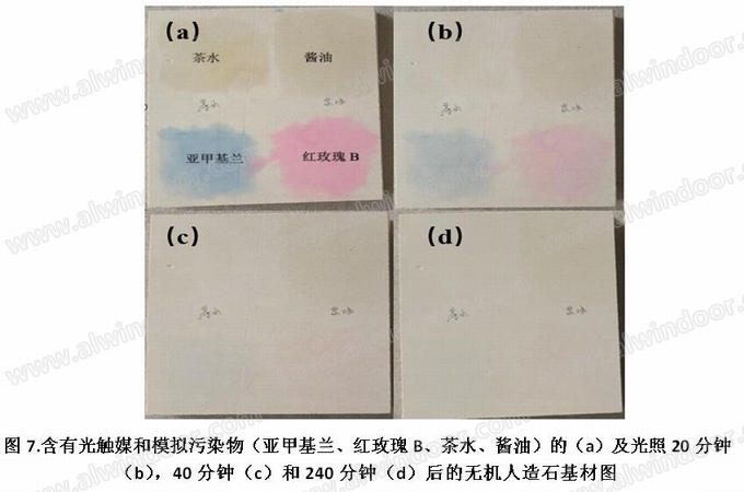 在實現了把無機人造石基材質量做好、質量穩定的基礎上,廣東美博開始進行無機人造石與光觸媒結合的實驗。經過兩年多反復實驗及參考大量中外文獻,廣東美博成功地將無機人造石與光觸媒有效地偶聯。通過對模擬污染物(亞甲基蘭、紅玫瑰B、茶水、醬油)的自然光降解(詞條“光降解”由行業大百科提供)比對(圖7),證明了光觸媒無機人造石對污染物有很好的降解能力。