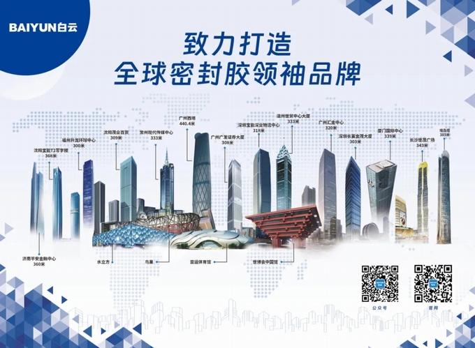 至今,國產的白云牌超高性能密封膠陸續(xù)應用在國內外各大城市的標志性項目與超高層項目上。在密封膠行業(yè)崛起的浪潮中,白云科技勇立潮頭,敢為人先,以科技創(chuàng)新開拓進取,書寫中國品牌的故事!