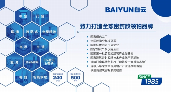 面對科技領域普遍存在的“卡脖子”難題,白云科技沒有選擇回避或繞行,而是迎難而上,敢于在密封膠這一關鍵材料領域發(fā)起挑戰(zhàn)。白云科技深知,只有不斷突破技術壁壘,才能為國家的現代化建設貢獻更多“硬核”力量。白云科技不斷拓展產品應用領域,不僅為幕墻系統(tǒng)、門窗系統(tǒng)(詞條“門窗系統(tǒng)”由行業(yè)大百科提供)、中空玻璃、裝配式建筑、全屋精裝,更為交通、5G通訊&電子、能源、電器、顯示&照明、智能家居等領域提供完善、全面、優(yōu)質的密封粘接解決方案,賦能國家新基建、戰(zhàn)略新興產業(yè)等各行各業(yè),助力高質量發(fā)展。