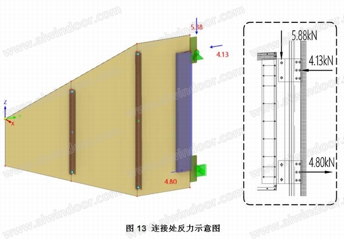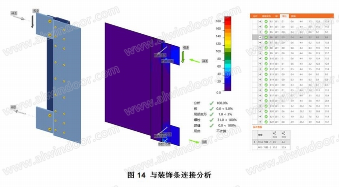 裝飾帶與立柱的連接是設計的關鍵,這里我們進行了有限元分析,參見圖13、圖14、圖15,通過有限元分析,論證了端部封板通過間隔布置的自攻螺釘及連接板(詞條“連接板”由行業大百科提供)將荷載有效的傳遞給了幕墻的立柱。