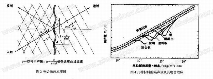 如果板在斜入射聲波激發(fā)下產(chǎn)生的受迫彎曲波的傳播速度Cf等于板固有的自由彎曲波傳播速度Cb時,即出現(xiàn)Cf = Cb時,將產(chǎn)生“吻合效應(yīng)”,這時墻板會非常“順從”地跟隨入射聲波彎曲,使大量聲能透射到另一側(cè),形成隔聲量的低谷,詳見圖3。