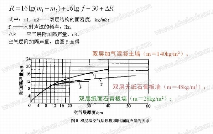 雙層墻的隔聲量可以用單位面積質(zhì)量等于雙層墻兩側(cè)墻體單位面積質(zhì)量之和的單層墻的隔聲量加上一個空氣間層附加隔聲量來表示,在工程應(yīng)用中,隔聲量計算的經(jīng)驗(yàn)公式: