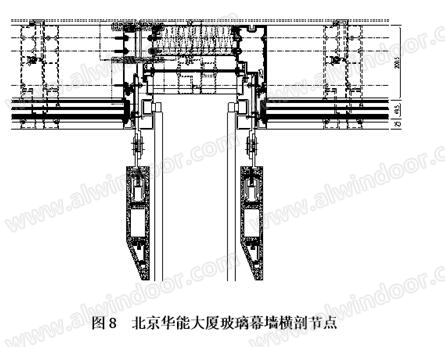 北京華能大廈玻璃幕墻為帶陶磚翼的定制鋁擠型材并具熱斷橋的室外單元式幕墻。單元的可視區(qū)域使用雙中空夾膠玻璃(6mm HS /1.5 INTERLAYER / 6mm HS /12mm AS /6mm HS /12mm AS/6mm),窗間墻區(qū)域使用中空玻璃(6mm HS /1.5 INTERLAYER / 6mm HS /12mm AS /6mm HS 中空玻璃)并帶有保溫隔熱(詞條“隔熱”由行業(yè)大百科提供)的背襯板陰影箱,豎向內(nèi)凹處使用單片玻璃(6mm鋼化)及100mm保溫隔熱背襯板陰影箱,詳見右圖8。