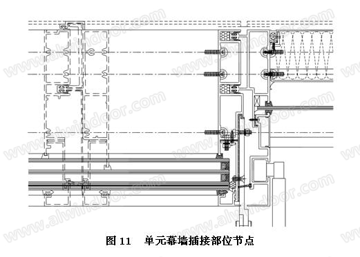 最后一些聲橋部位也進(jìn)行了隔聲處理:鋁型材采用斷橋式為多層復(fù)合材料組成,單元插接部位采用了5道膠條密封,玻璃和框的密封采用膠條、密封膠、雙面貼、膠條4道密封方式,有效的阻止了聲波向室內(nèi)的傳播,詳見圖11。
