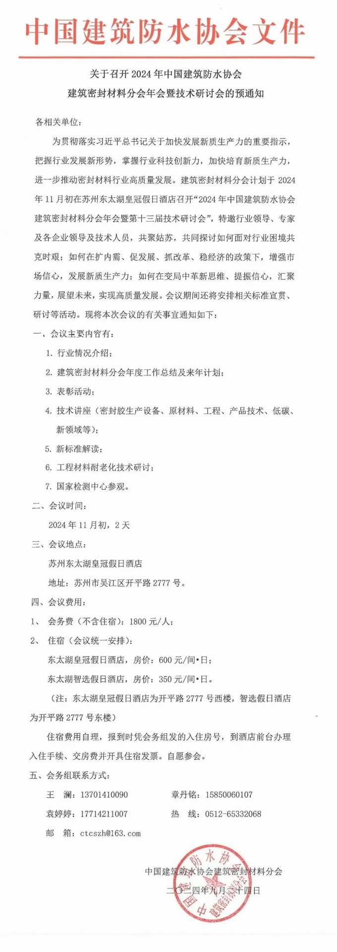 關(guān)于召開2024年中國建筑防水協(xié)會(huì)建筑密封材料分會(huì)年會(huì)暨技術(shù)研討會(huì)的預(yù)通知