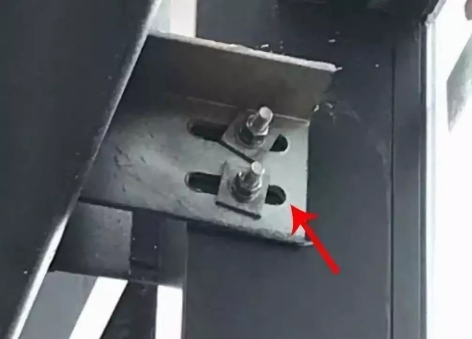 問題描述:龍骨轉接件連接螺栓處墊片未焊接,不能有效承擔風荷載,當風荷載作用時候,龍骨與轉接件可能會產生相對位移,從而破壞面板之間的密封膠,致結構體系不穩定,面板間產生滲漏隱患。