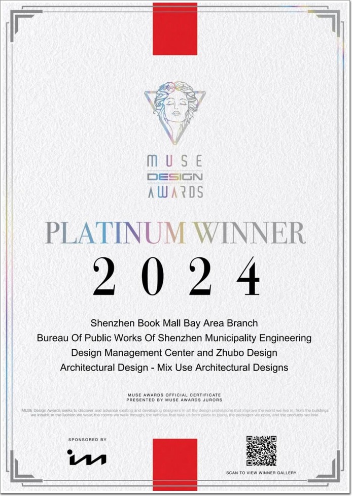 該項目斬獲2024年繆斯設計獎鉑金獎。該獎項分為鉑金獎、金獎、銀獎三個等級的榮譽,目前是全球設計領域最具影響力的獎項之一,并以嚴格的評審體系、高質量的評判標準著稱。