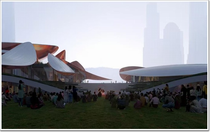 安吉"兩山"未來(lái)科技城文化藝術(shù)中心是由MAD建筑事務(wù)所、同濟(jì)大學(xué)建筑設(shè)計(jì)院和上海建工裝飾集團(tuán)傾力打造的精品建筑作品。"我們希望這座建筑能夠像從竹海中自然生長(zhǎng)出來(lái)一樣",MAD建筑方案團(tuán)隊(duì)從安吉特有的竹文化中汲取靈感,建筑師通過(guò)參數(shù)化設(shè)計(jì)將竹葉的優(yōu)雅形態(tài)轉(zhuǎn)化為建筑語(yǔ)言。每一片"竹葉"屋面都是獨(dú)一無(wú)二的異形自由曲面,葉片最大懸挑達(dá)37米,最長(zhǎng)跨度151米,構(gòu)成了極具視覺(jué)沖擊力的建筑輪廓線。