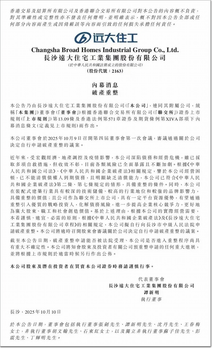 港股上市公司遠大住工,2025年10月10日發布內幕消息——破產重整公告,公司董事會于10月9日召開第四屆董事會第一次會議,審議通過關于公司決定自行申請破產重整的議案。