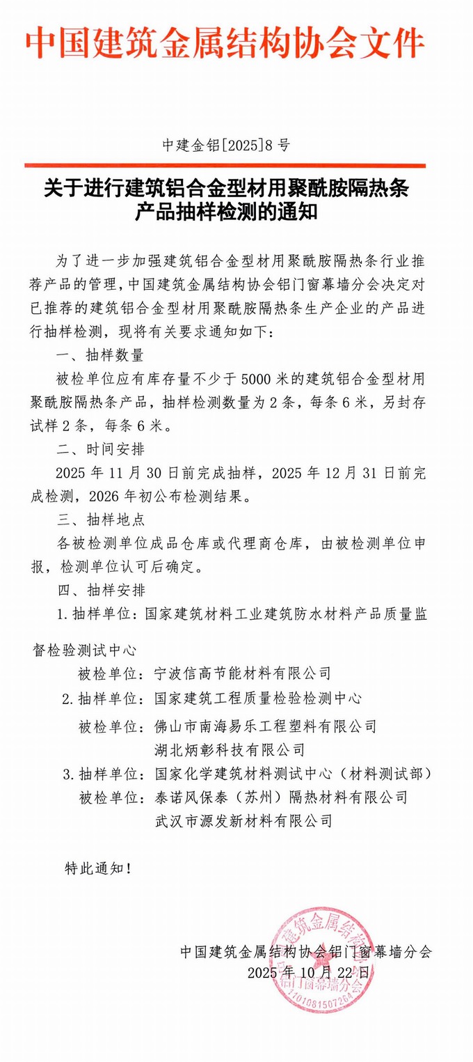 為了進(jìn)一步加強(qiáng)建筑鋁合金型材用聚酰胺隔熱條行業(yè)推薦產(chǎn)品的管理,中國(guó)建筑金屬結(jié)構(gòu)協(xié)會(huì)鋁門窗幕墻分會(huì)決定對(duì)已推薦的建筑鋁合金型材用聚酰胺隔熱條生產(chǎn)企業(yè)的產(chǎn)品進(jìn)行抽樣檢測(cè),現(xiàn)將有關(guān)要求通知如下: