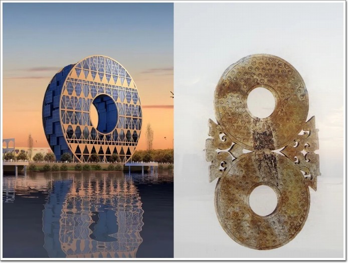 建筑設計靈感來自于中國傳統的玉璧,建筑和在珠江的倒影,形似雙環玉璧,同時也形似數字8和無窮大的符號,在中國文化中具有強烈的解讀價值。建筑的設計方案來自意大利的JDP architects,同時借鑒意大利文藝復興“化圓為方”的寓意,立面的外圓和內圓支撐著建筑各層樓板,如同完美地“化圓為方”,塑造出怡人的內部空間。