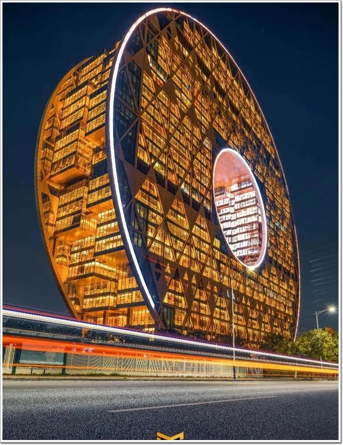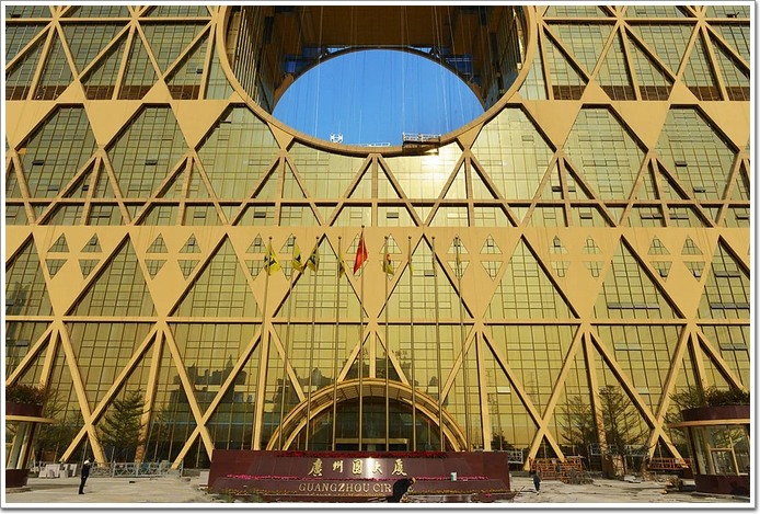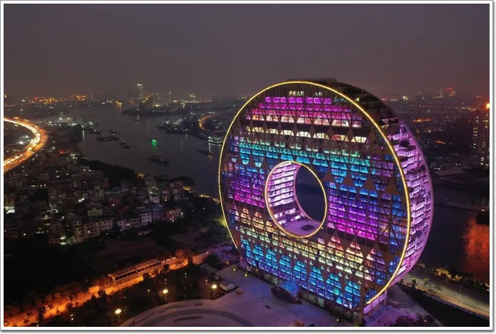 大廈高 138 米、建筑面積 10.5 萬平方米,外圓直徑 146.6 米的同心圓結構,配上金色玻璃幕墻,在珠江水里的倒影湊成一個 “8” 字,寓意 “交易風生水起”。